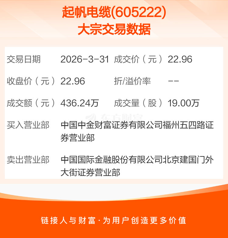 2026年3月31日,起帆电缆发生1笔大宗交易,共成交19.00万股,成交金额436.24万元,占其流通市值比例为0.05%。