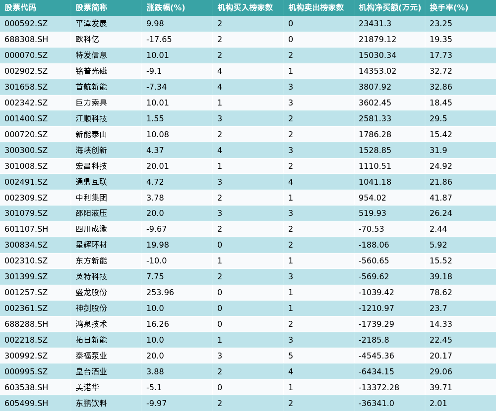 南财智讯3月31日电,盘后数据显示,因当日异动登上龙虎榜的个股中,25只沪深A股龙虎榜出现了机构的身影,机构合计净买入23369.12万元,具体来看,机构净买入13只个股,净卖出12只个股。其中,机构净买入前三分别为平潭发展(000592.SZ)、欧科亿(688308.SH)与特发信息(000070.SZ),详情见下图:机构净卖出的个股中,前三分别为东鹏饮料(605499.SH)、美诺华(603538.SH)与皇台酒业(000995.SZ)。