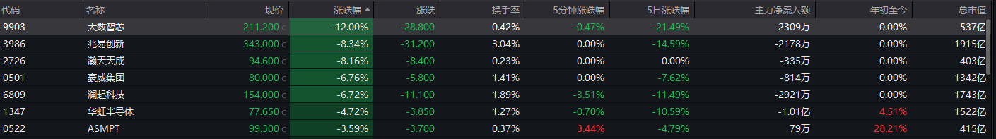 半导体板块跌幅居前,天数智芯跌12%,兆易创新、瀚天天成跌超8%