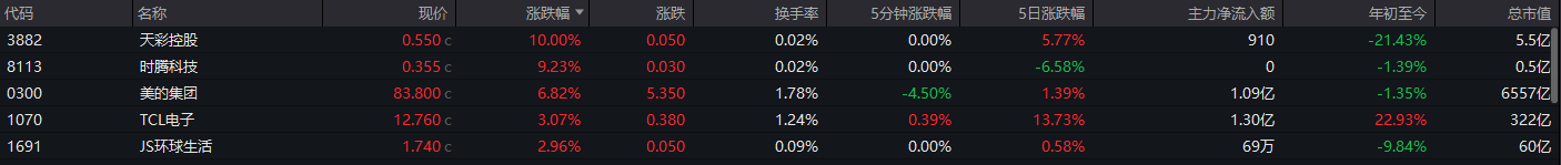 家电板块上涨,天彩控股涨10%,时腾科技涨超9%,美的集团涨超6%。