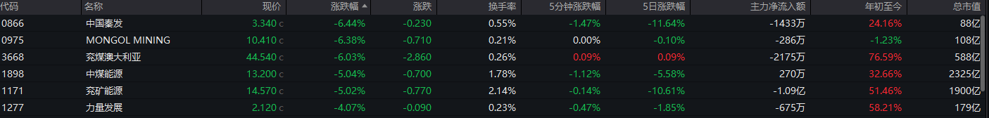 煤炭板块下挫,中国秦发、MONGOL MINING、兖煤澳大利亚跌超6%。