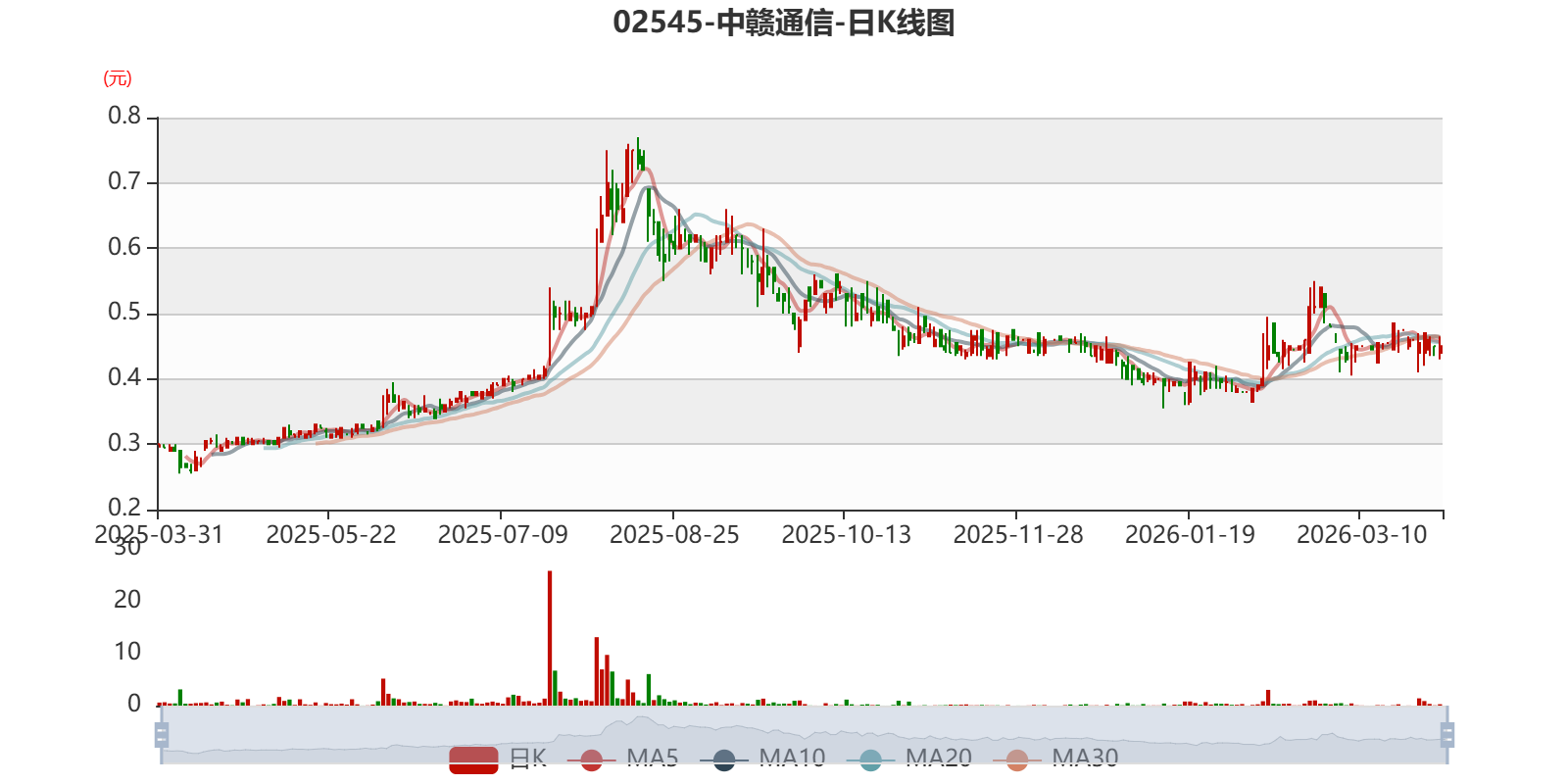 以3月31日收盘价计算,中赣通信目前市盈率(TTM)约34.05倍,市净率(TTM)约0.6倍,市销率(TTM)约0.57倍。