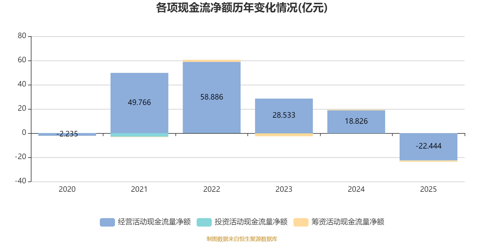 2025年,公司经营活动现金流净额为-22.44亿元,同比减少41.27亿元;筹资活动现金流净额-1.03亿元,同比减少1.53亿元;投资活动现金流净额-2006.36万元,上年同期为-1955.68万元。