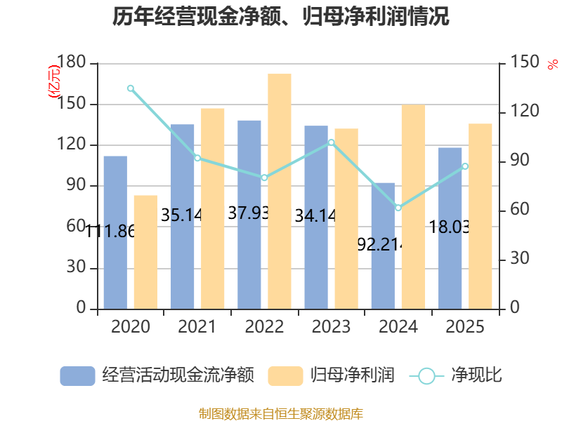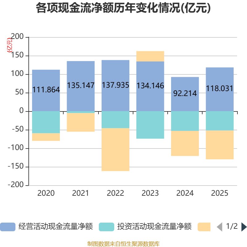 截至2025年,公司经营活动现金流净额为118.03亿元,同比增长28%;筹资活动现金流净额-77.68亿元,同比减少9.96亿元;投资活动现金流净额-52.3亿元,上年同期为-53.28亿元。