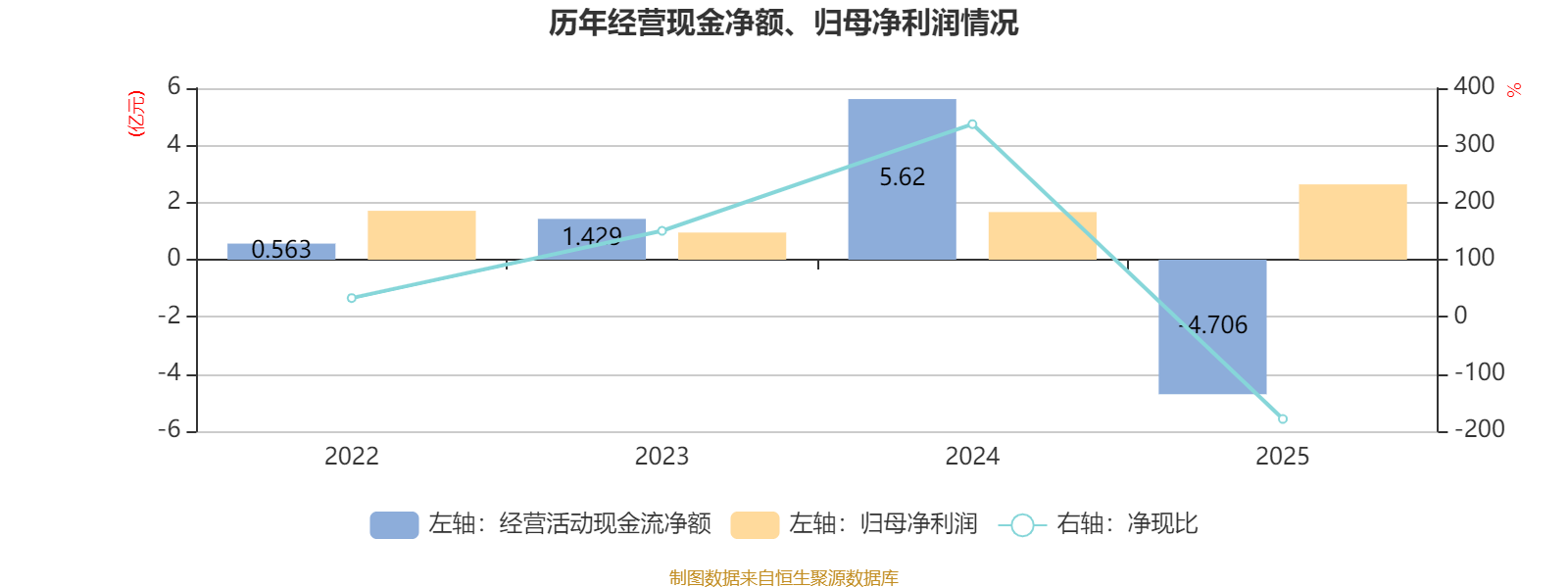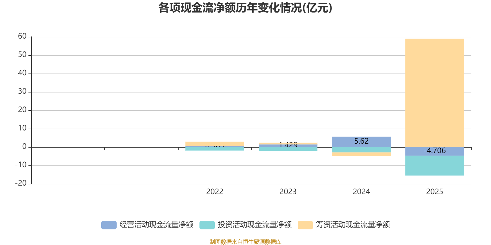 2025年,公司经营活动现金流净额为-4.71亿元,同比减少10.33亿元;筹资活动现金流净额58.91亿元,同比增加60.92亿元;投资活动现金流净额-10.84亿元,上年同期为-2.94亿元。