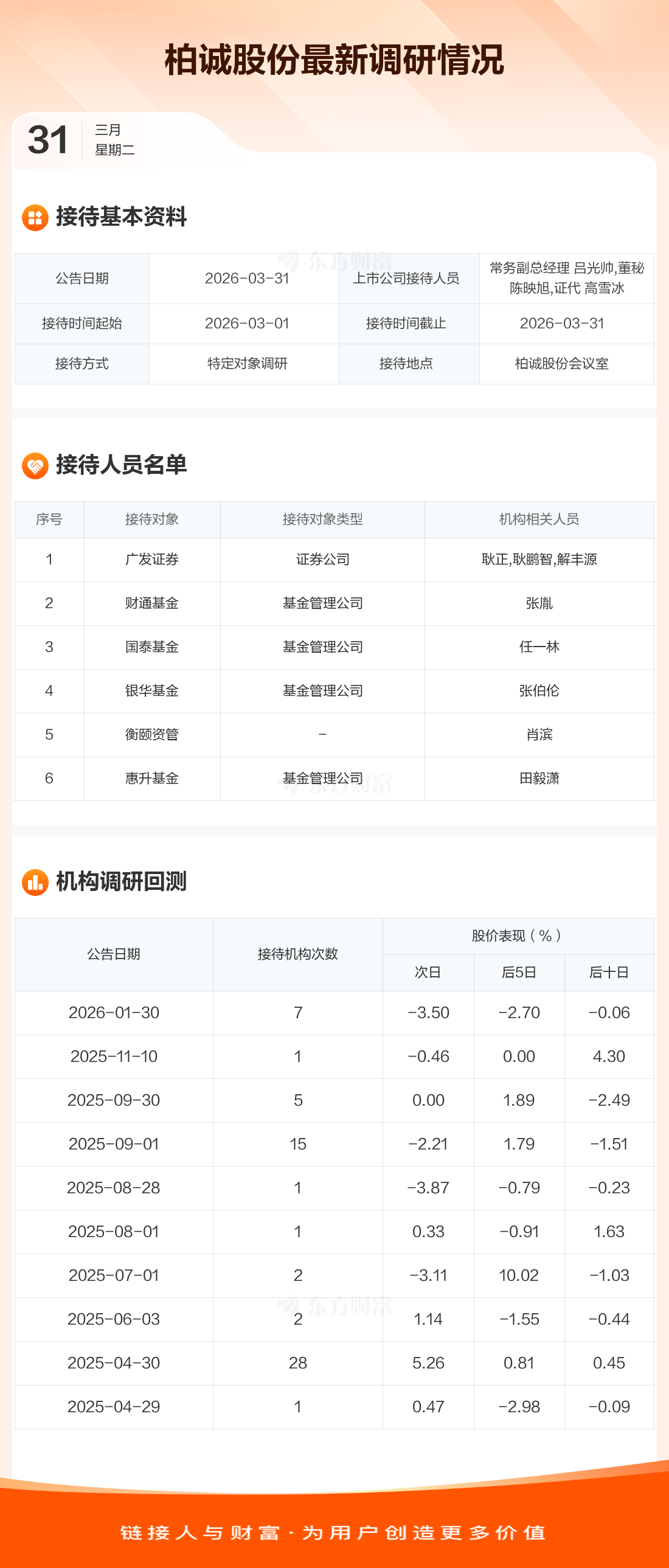 柏诚股份3月31日公告称,3月1日至3月31日接待广发证券等6家机构调研。接待人员包括常务副总经理 吕光帅,董秘 陈映旭,证代 高雪冰。