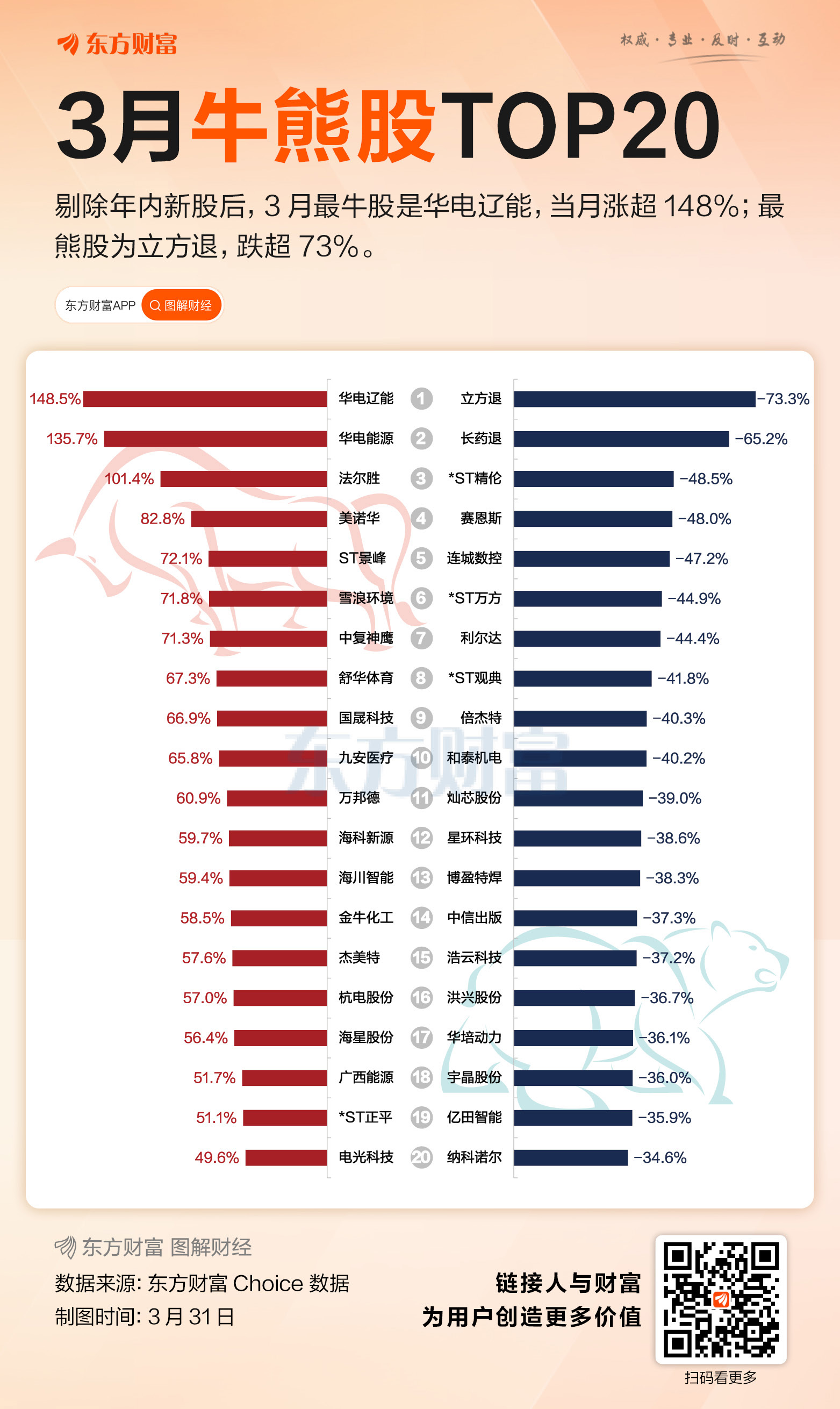 下跌个股中,两只退市整理股跌幅最大,立方退当月跌超73%,长药退跌超65%。公告显示,立方退于3月31日进入退市整理期,退市整理期为15个交易日,预计最后交易日期为2026年4月21日;长药退于3月20日进入退市整理期,退市整理期为15个交易日,预计最后交易日期为2026年4月10日。