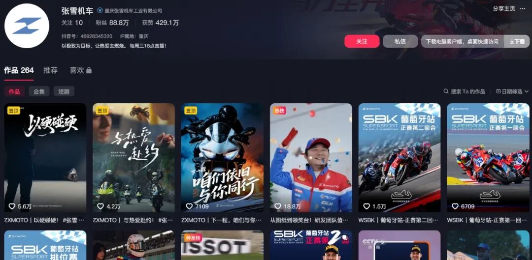 张雪机车成立仅4个月便开通抖音账号,目前已发布265个作品,积累约80万粉丝。账号每周三固定直播,由张雪本人出镜讲解产品。
