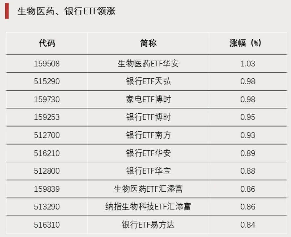 3月31日,ETF涨幅普遍较小。生物医药ETF华安以1.03%的涨幅居首,银行类ETF集体走强,银行ETF天弘、银行ETF博时、银行ETF南方等多只产品涨幅近1%。
