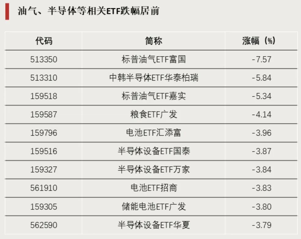 中韩半导体ETF华泰柏瑞跌5.84%,多只粮食、电池、半导体设备等主题ETF下跌超3%。
