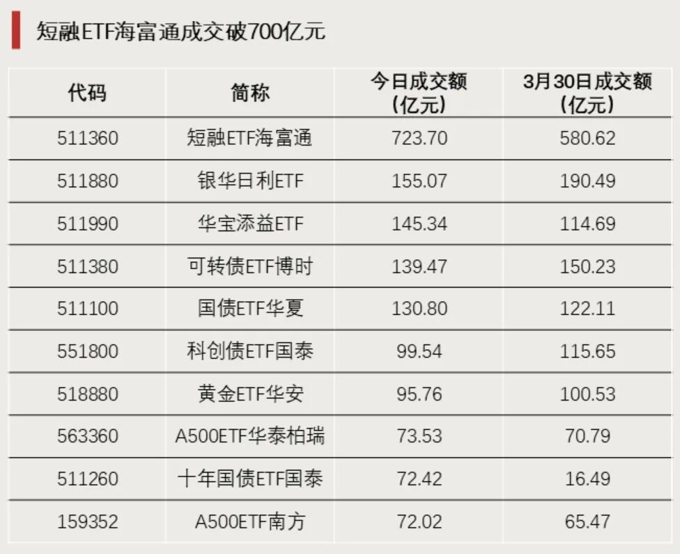 固收类ETF成交依旧活跃。3月31日,短融ETF海富通成交额达723.70亿元,较前一交易日的580.62亿元明显放量。银华日利ETF、华宝添益ETF两只货币ETF分别成交155.07亿元、145.34亿元。可转债ETF博时、国债ETF华夏等债券ETF成交额均超百亿元。