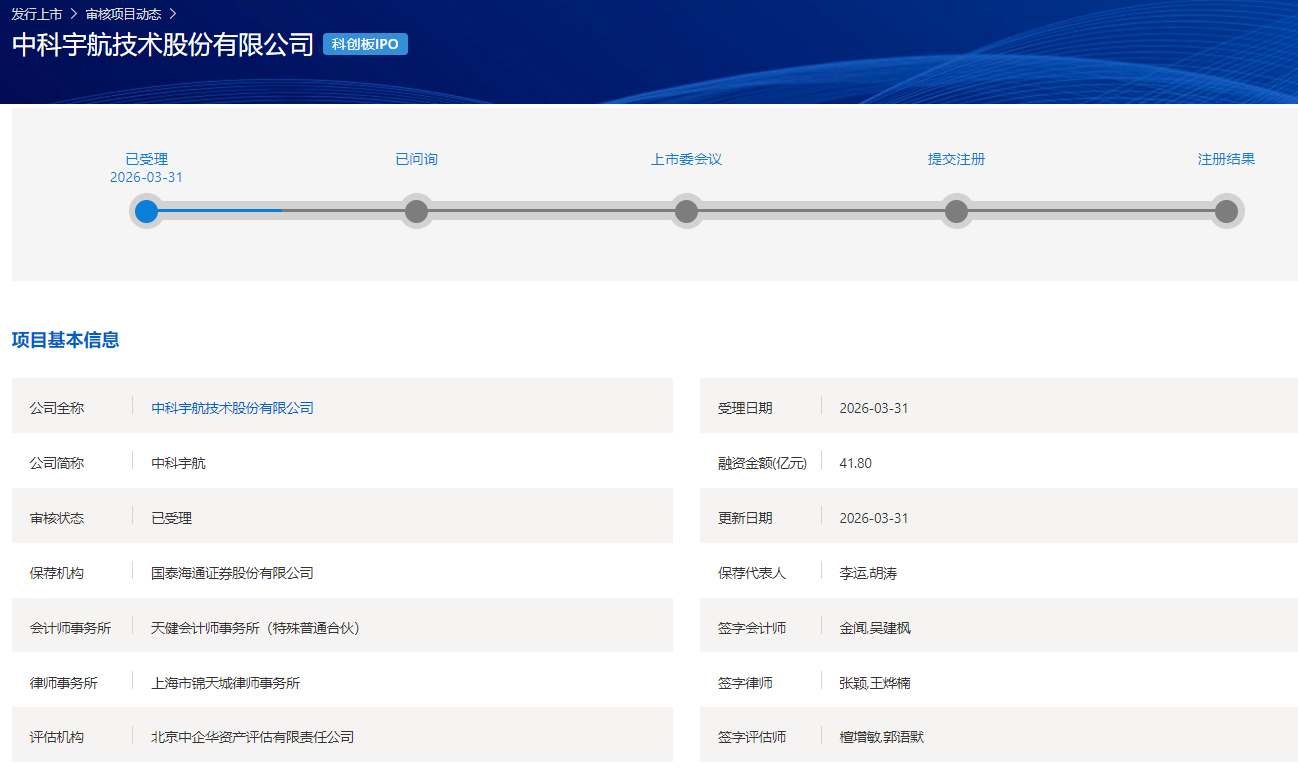 【大河财立方消息】3月31日,中科宇航技术股份有限公司(以下简称中科宇航)递交科创板上市招股书,获上交所受理。