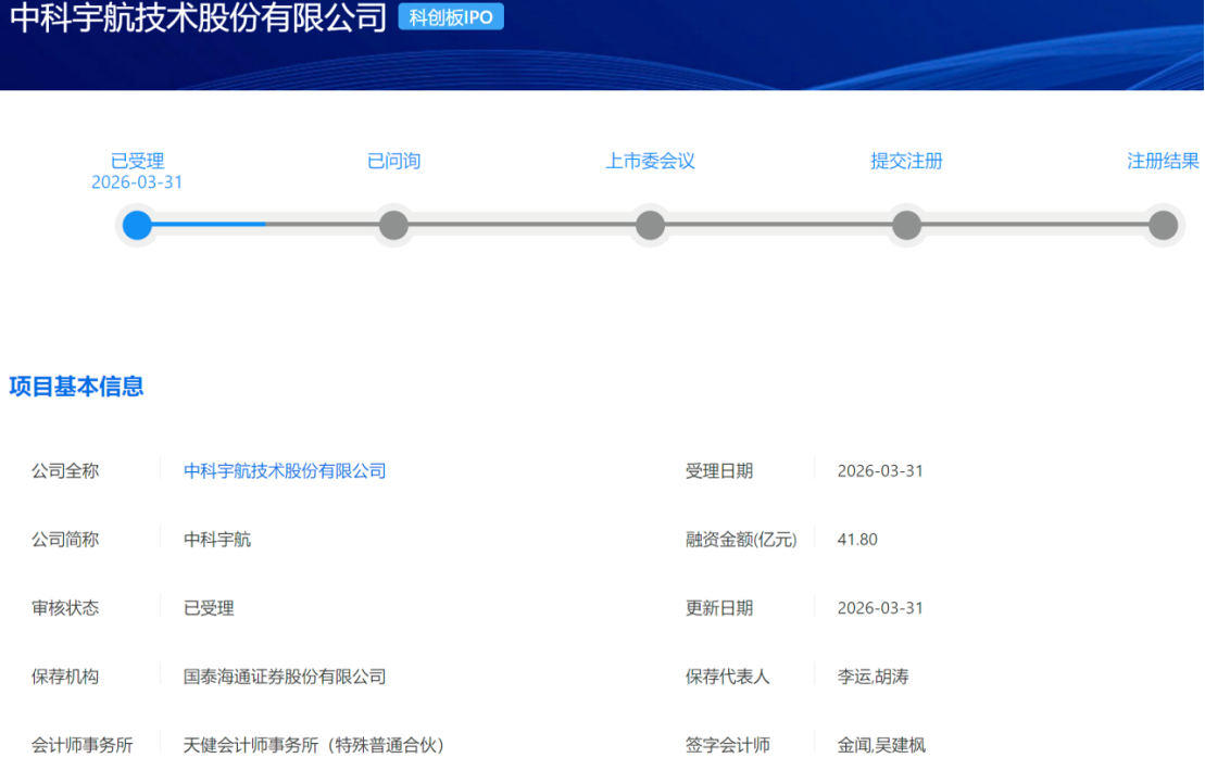 3月31日,中科宇航科创板IPO申请获受理。本次拟募资金额41.80亿元,将重点用于低成本、可重复使用大型运载火箭和可重复使用运载器与航天器等产品的研制。
