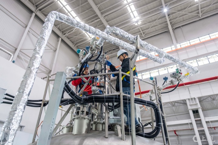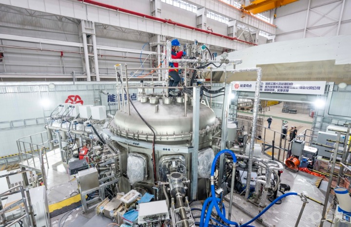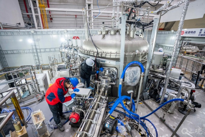 3月31日下午,工作人员对全球首台全高温超导托卡马克装置——“洪荒70”关键部件进行检查、维修工作,为下一轮实验做准备。
