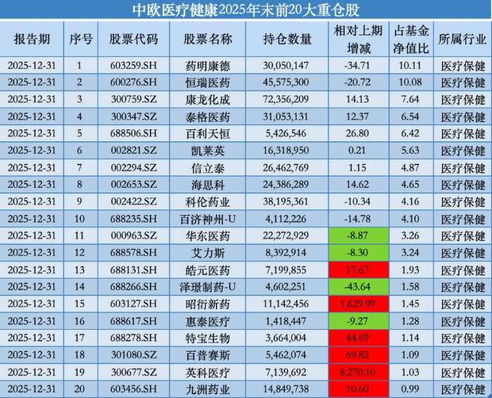具体来看,截至2025年末,中欧医疗健康共持有130只股票。据此前披露的2025年四季报,中欧医疗健康的前十大重仓股较2025年三季度期间并未发生更迭,依次为:药明康德(603259.SH)、恒瑞医药(600276.SH)、康龙化成(300759.SZ)、泰格医药(300347.SZ)、百利天恒(688506.SH)、凯莱英(002821.SZ)、信立泰(002294.SZ)、海思科(002653.SZ)、科伦药业(002322.SZ)、百济神州-U(688235.SH)。