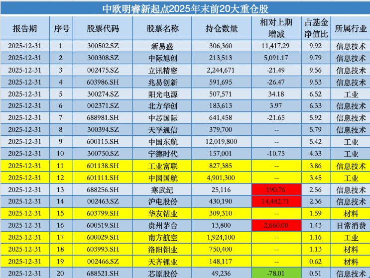据最新披露的年报数据,中欧明睿新起点在2025年下半年重新买回了工业富联(601138.SH)、华友钴业(603799.SH)、天齐锂业(002466.SZ),并首次建仓中国国航(601111.SH)、南方航空(600029.SH)、洛阳钼业(603993.SH)。