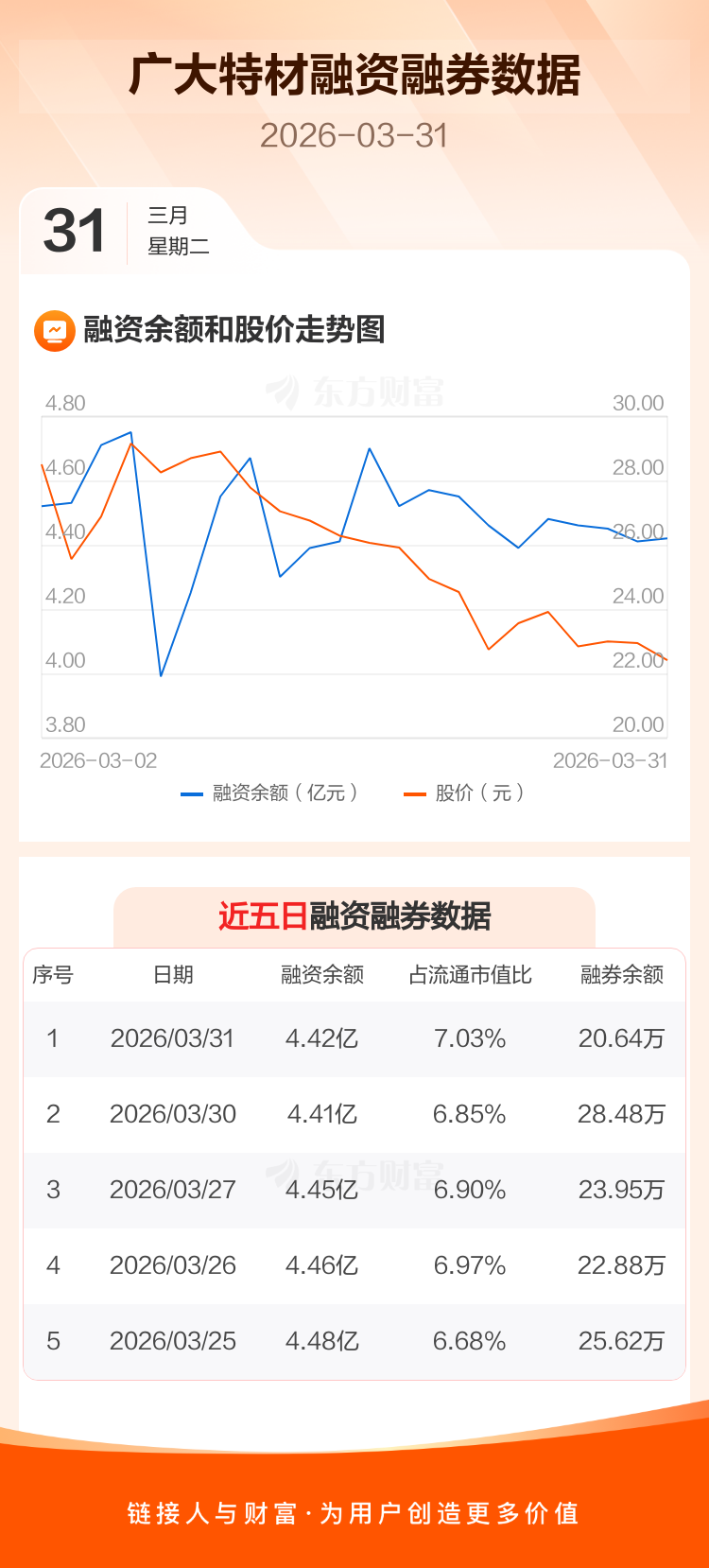 交易所最新数据显示,广大特材于2026年3月31日获融资买入1449.30万元,融资偿还1330.15万元,当日融资净买入119.15万元。目前,该股融资余额4.42亿,占流通市值比例为7.03%。