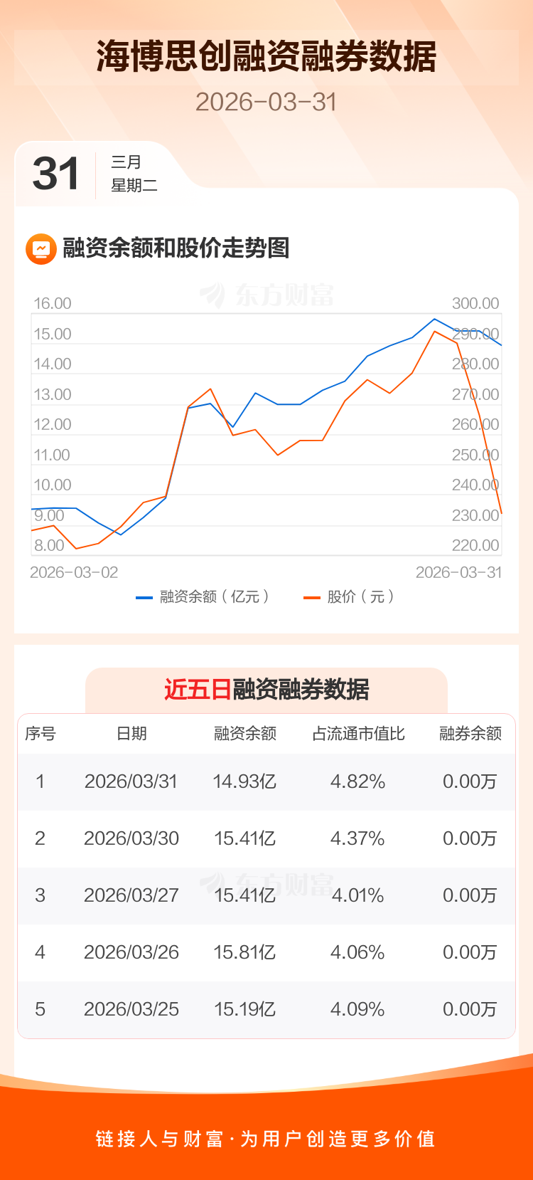 交易所最新数据显示,海博思创于2026年3月31日获融资买入3.09亿元,融资偿还3.57亿元,当日融资净偿还4815.56万元。目前,该股融资余额14.93亿,占流通市值比例为4.82%。