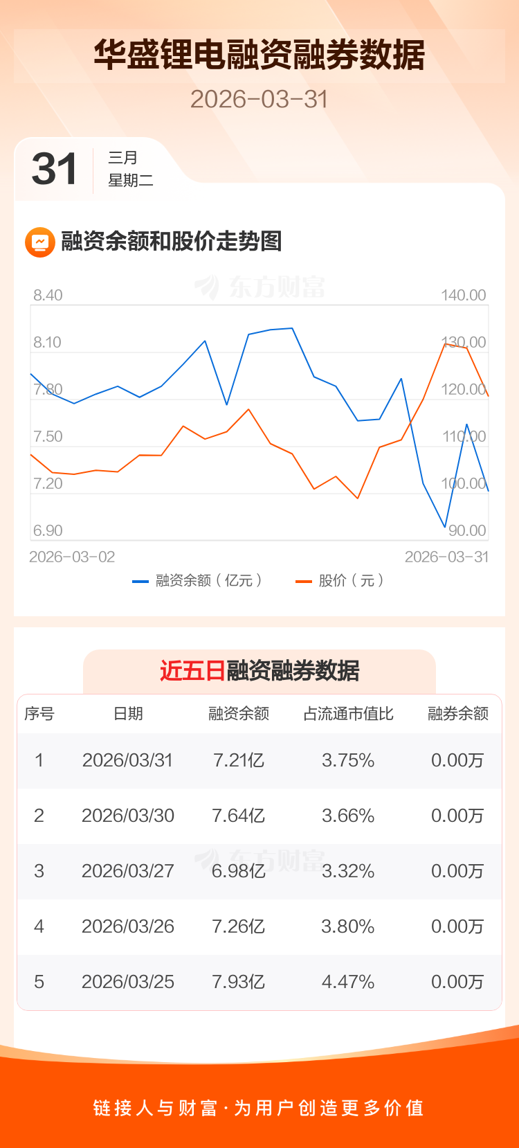 交易所最新数据显示,华盛锂电于2026年3月31日获融资买入1.23亿元,融资偿还1.66亿元,当日融资净偿还4282.91万元。目前,该股融资余额7.21亿,占流通市值比例为3.75%。