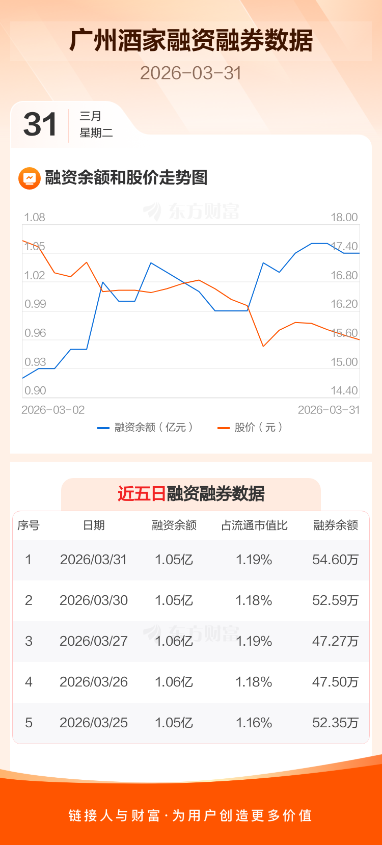 交易所最新数据显示,广州酒家于2026年3月31日获融资买入567.11万元,融资偿还535.66万元,当日融资净买入31.45万元。目前,该股融资余额1.05亿,占流通市值比例为1.19%。