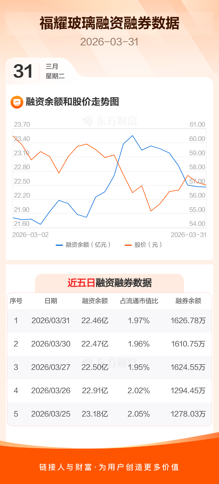 交易所最新数据显示,福耀玻璃于2026年3月31日获融资买入2653.47万元,融资偿还2794.68万元,当日融资净偿还141.21万元。目前,该股融资余额22.46亿,占流通市值比例为1.97%。