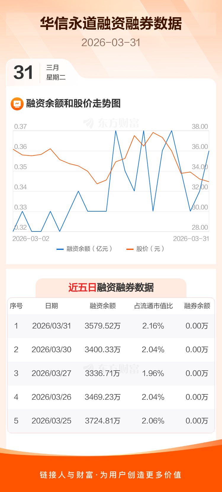 交易所最新数据显示,华信永道于2026年3月31日获融资买入370.11万元,融资偿还190.92万元,当日融资净买入179.18万元。目前,该股融资余额3579.52万,占流通市值比例为2.16%。