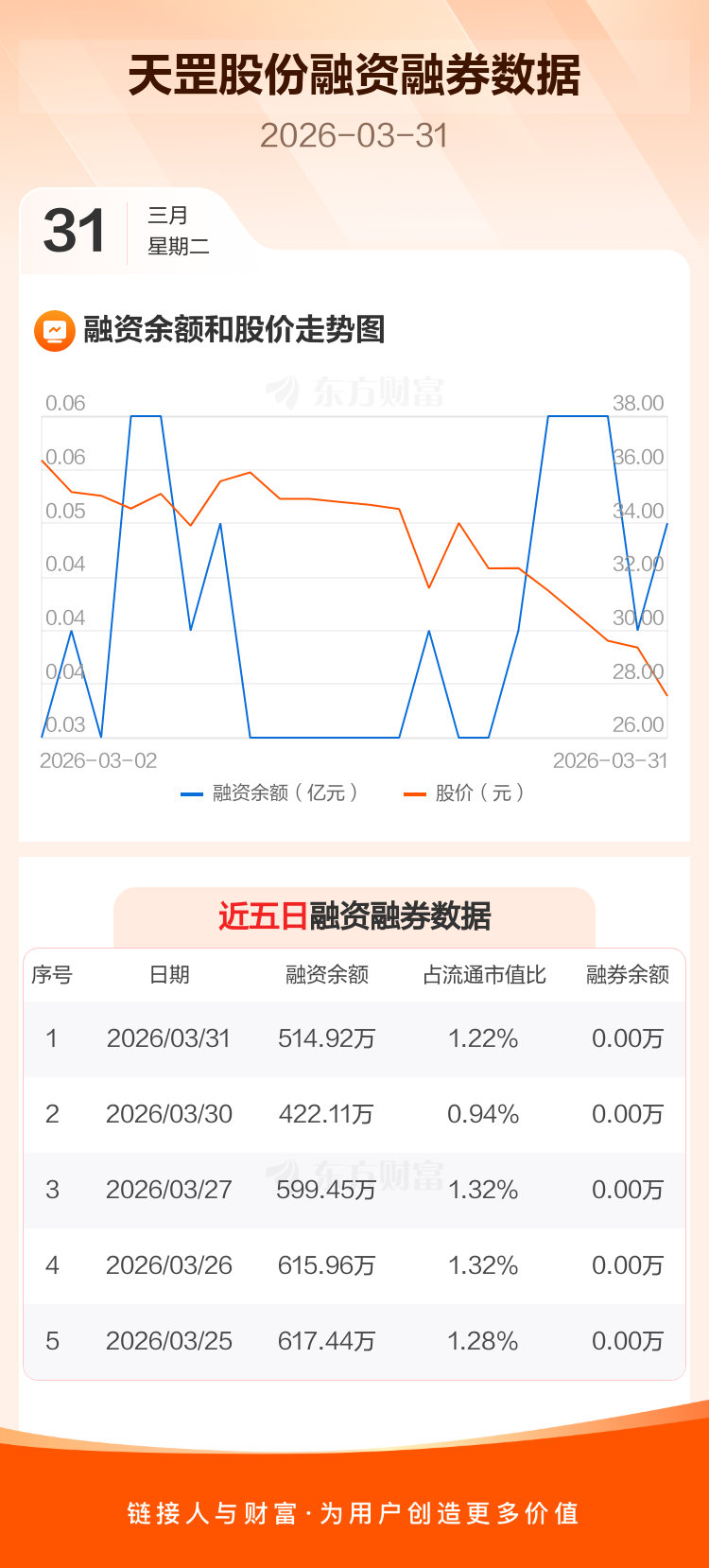 交易所最新数据显示,天罡股份于2026年3月31日获融资买入164.28万元,融资偿还71.47万元,当日融资净买入92.8万元。目前,该股融资余额514.92万,占流通市值比例为1.22%。