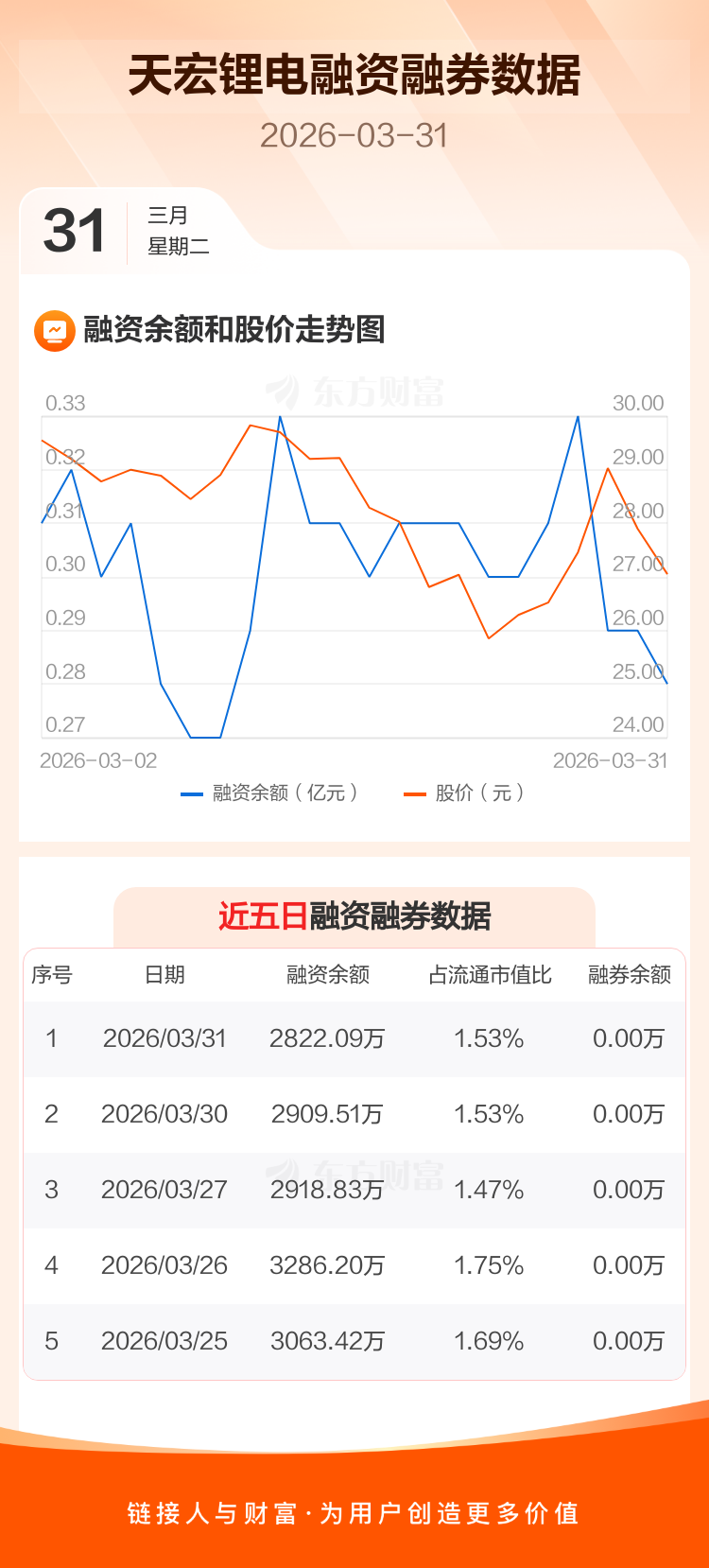 交易所最新数据显示,天宏锂电于2026年3月31日获融资买入158.06万元,融资偿还245.48万元,当日融资净偿还87.42万元。目前,该股融资余额2822.09万,占流通市值比例为1.53%。