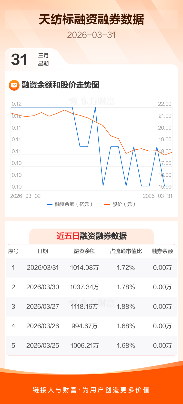 交易所最新数据显示,天纺标于2026年3月31日获融资买入23.23万元,融资偿还46.49万元,当日融资净偿还23.26万元。目前,该股融资余额1014.08万,占流通市值比例为1.72%。