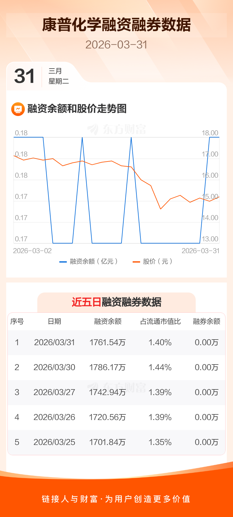 交易所最新数据显示,康普化学于2026年3月31日获融资买入32.13万元,融资偿还56.75万元,当日融资净偿还24.63万元。目前,该股融资余额1761.54万,占流通市值比例为1.40%。