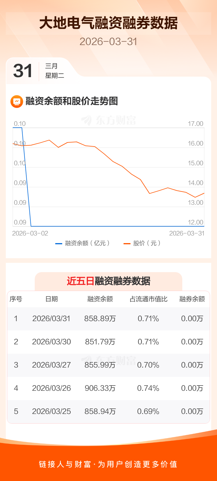 交易所最新数据显示,大地电气于2026年3月31日获融资买入10.28万元,融资偿还3.17万元,当日融资净买入7.1万元。目前,该股融资余额858.89万,占流通市值比例为0.71%。