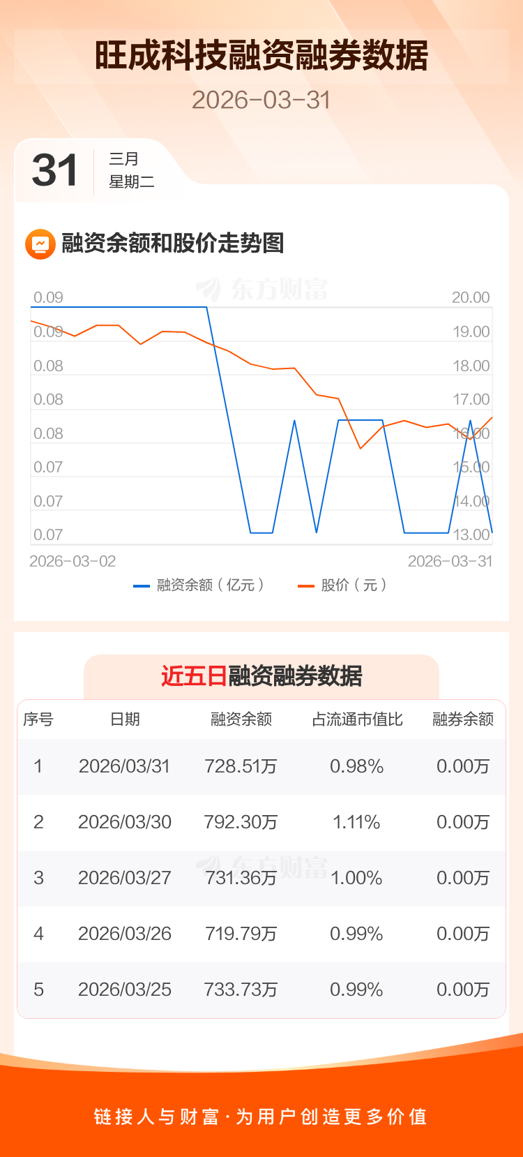 交易所最新数据显示,旺成科技于2026年3月31日获融资买入74.88万元,融资偿还138.67万元,当日融资净偿还63.79万元。目前,该股融资余额728.51万,占流通市值比例为0.98%。