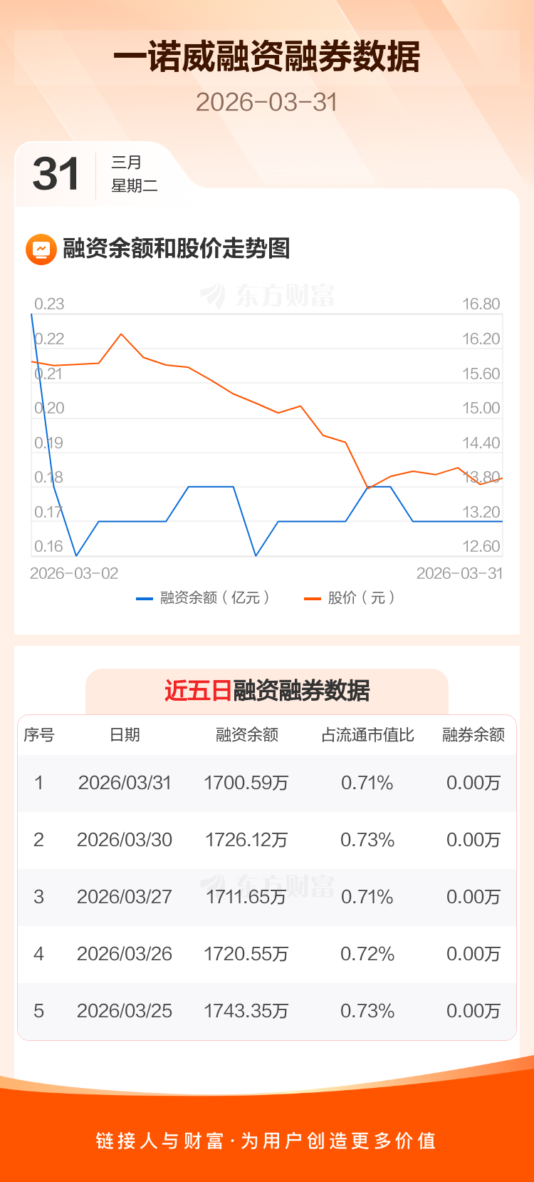 交易所最新数据显示,一诺威于2026年3月31日获融资买入46.58万元,融资偿还72.10万元,当日融资净偿还25.52万元。目前,该股融资余额1700.59万,占流通市值比例为0.71%。