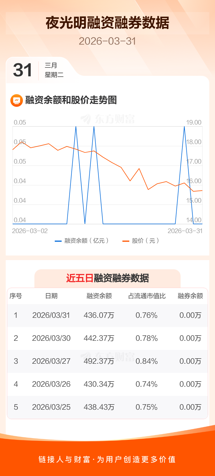 交易所最新数据显示,夜光明于2026年3月31日获融资买入18.80万元,融资偿还25.10万元,当日融资净偿还6.29万元。目前,该股融资余额436.07万,占流通市值比例为0.76%。