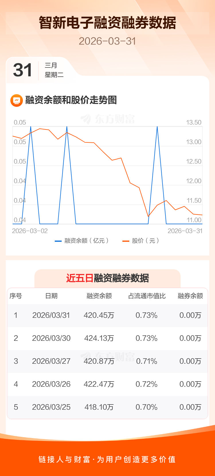 交易所最新数据显示,智新电子于2026年3月31日获融资买入11.39万元,融资偿还15.08万元,当日融资净偿还3.68万元。目前,该股融资余额420.45万,占流通市值比例为0.73%。