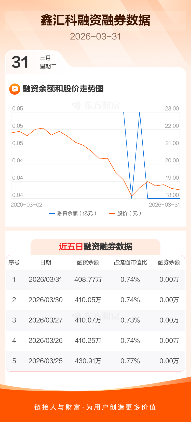 交易所最新数据显示,鑫汇科于2026年3月31日获融资买入4.51万元,融资偿还5.79万元,当日融资净偿还1.28万元。目前,该股融资余额408.77万,占流通市值比例为0.74%。