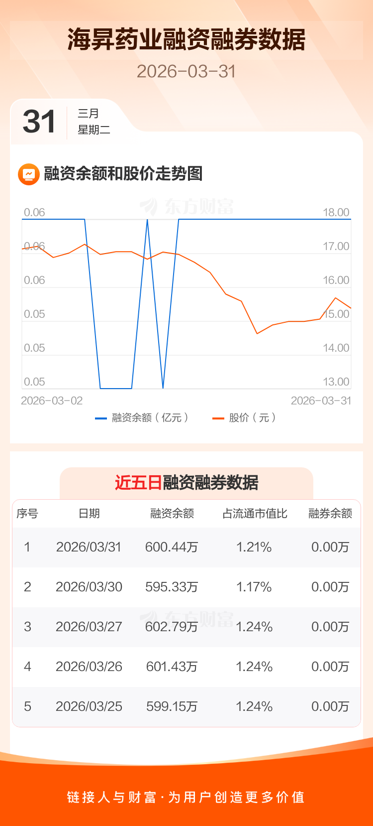 交易所最新数据显示,海昇药业于2026年3月31日获融资买入12.54万元,融资偿还7.43万元,当日融资净买入5.11万元。目前,该股融资余额600.44万,占流通市值比例为1.21%。