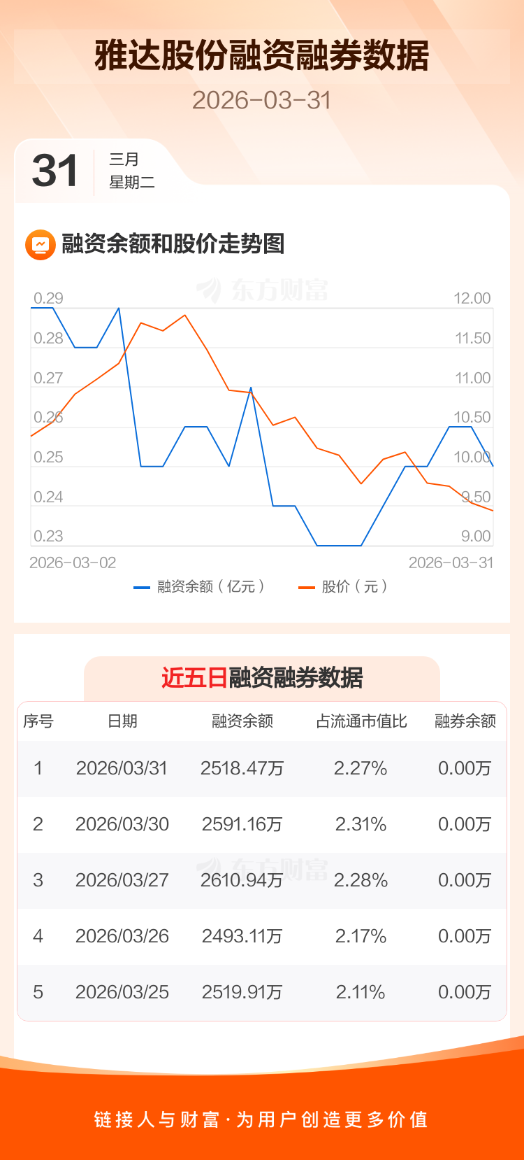 交易所最新数据显示,雅达股份于2026年3月31日获融资买入147.32万元,融资偿还220.01万元,当日融资净偿还72.69万元。目前,该股融资余额2518.47万,占流通市值比例为2.27%。