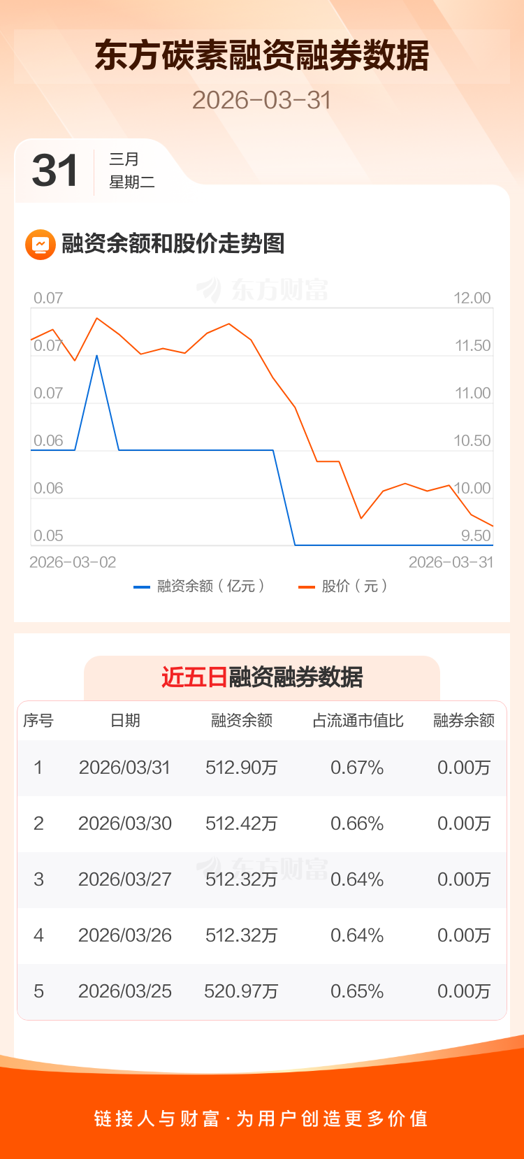 交易所最新数据显示,东方碳素于2026年3月31日获融资买入6.07万元,融资偿还5.59万元,当日融资净买入4812元。目前,该股融资余额512.90万,占流通市值比例为0.67%。