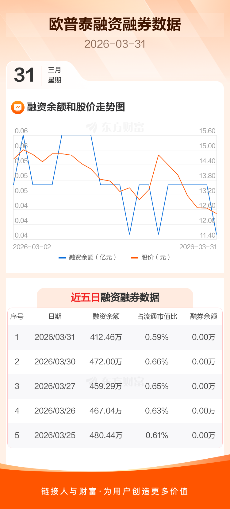 交易所最新数据显示,欧普泰于2026年3月31日获融资买入10.17万元,融资偿还69.71万元,当日融资净偿还59.54万元。目前,该股融资余额412.46万,占流通市值比例为0.59%。