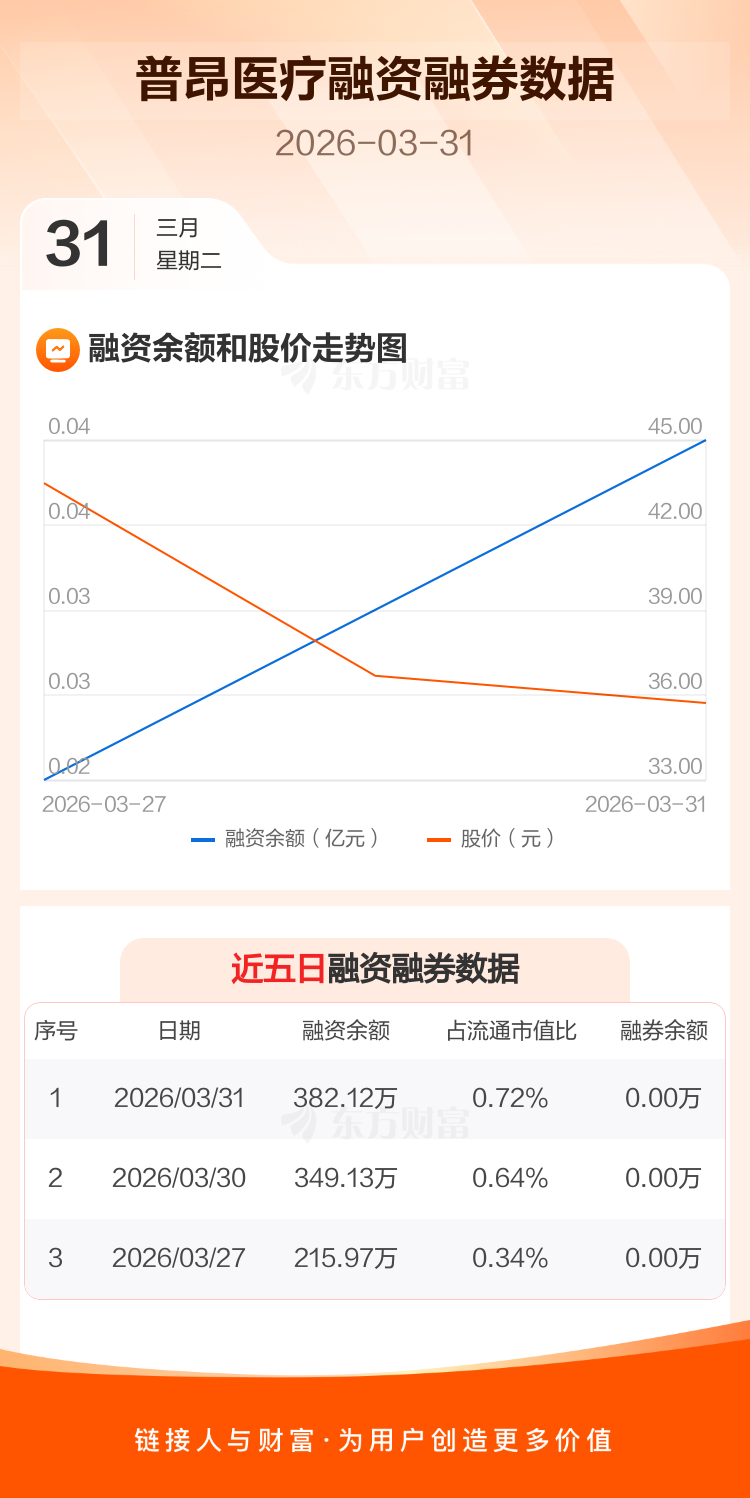交易所最新数据显示,普昂医疗于2026年3月31日获融资买入148.08万元,融资偿还115.09万元,当日融资净买入32.99万元。目前,该股融资余额382.12万,占流通市值比例为0.72%。
