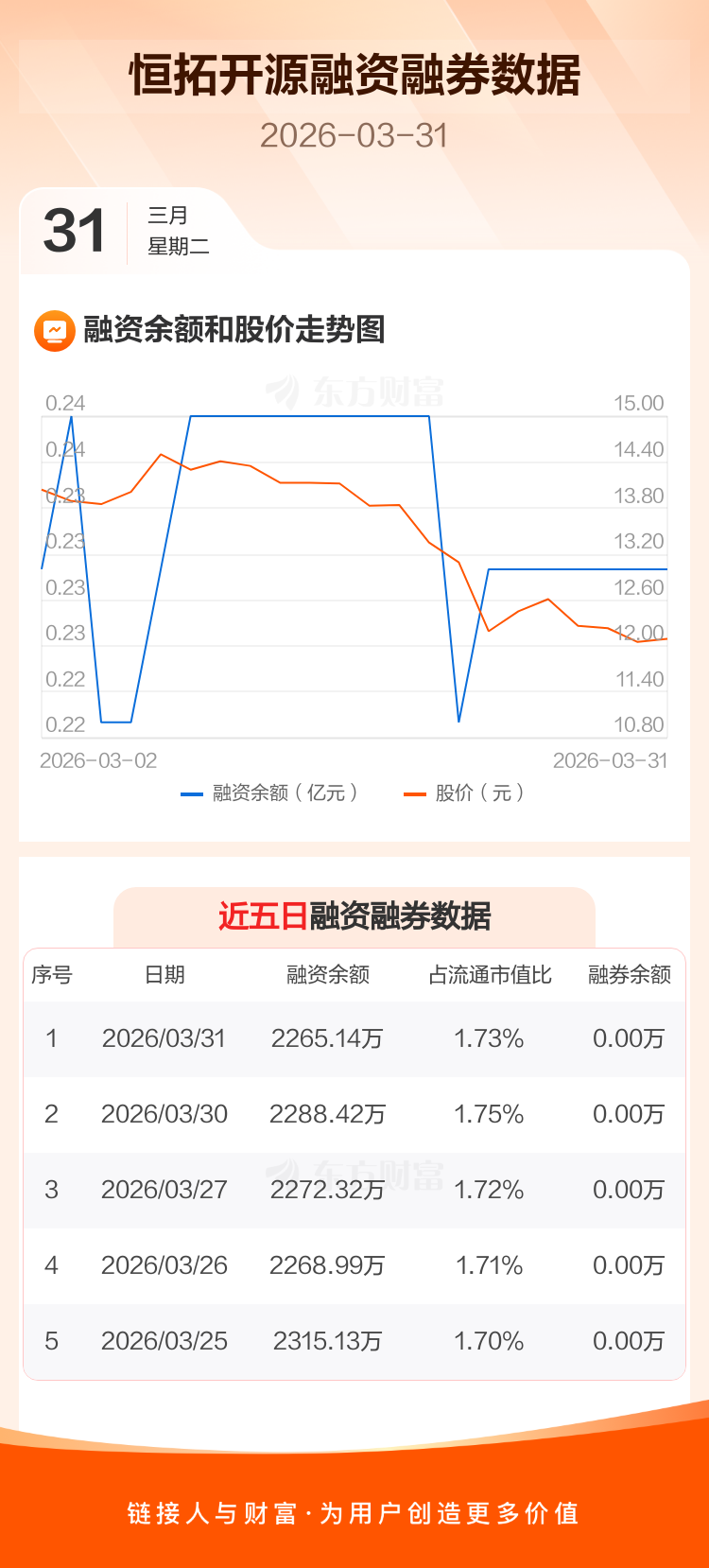 交易所最新数据显示,恒拓开源于2026年3月31日获融资买入102.57万元,融资偿还125.85万元,当日融资净偿还23.28万元。目前,该股融资余额2265.14万,占流通市值比例为1.73%。