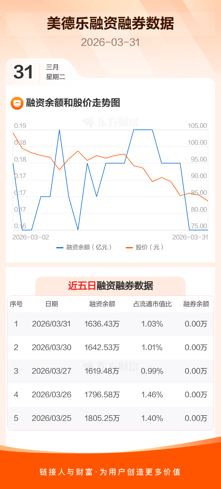 交易所最新数据显示,美德乐于2026年3月31日获融资买入46.81万元,融资偿还52.91万元,当日融资净偿还6.1万元。目前,该股融资余额1636.43万,占流通市值比例为1.03%。