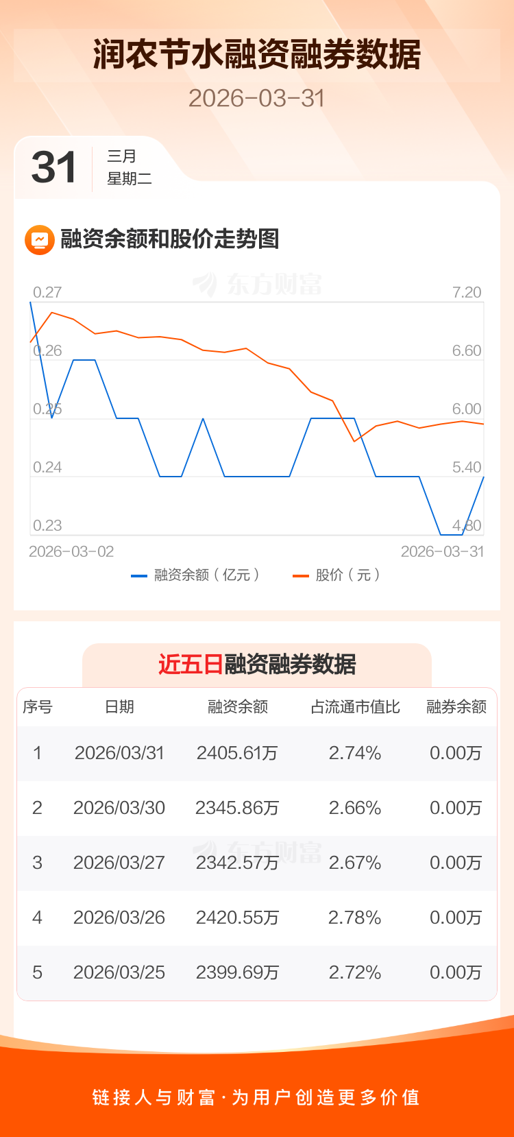 交易所最新数据显示,润农节水于2026年3月31日获融资买入59.81万元,融资偿还607元,当日融资净买入59.75万元。目前,该股融资余额2405.61万,占流通市值比例为2.74%。