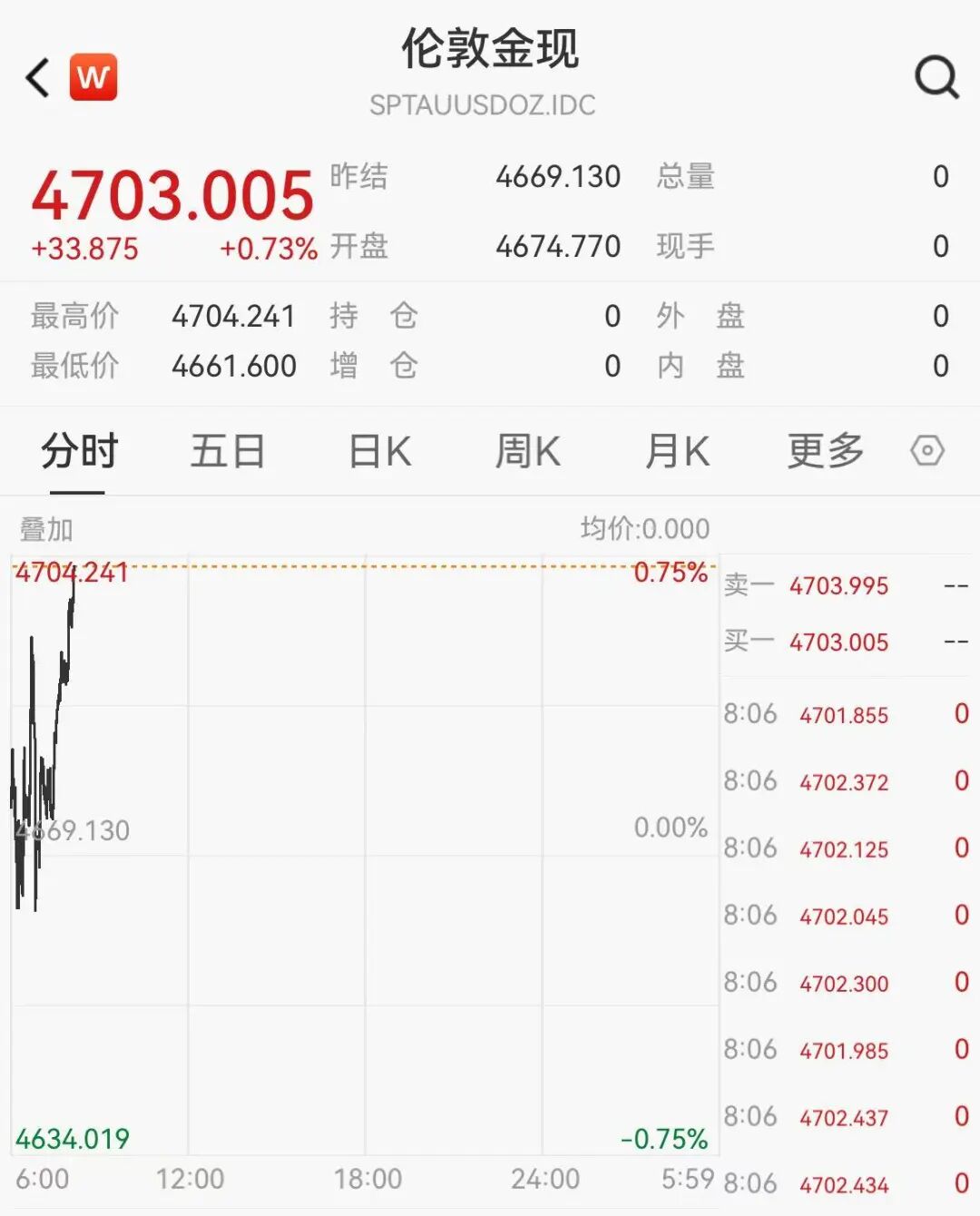 北京时间4月1日上午,现货黄金涨破4700美元,报4703美元/盎司,日内涨超0.7%,白银在75美元关口徘徊,现报74.9美元/盎司。