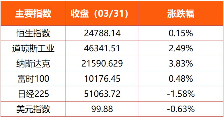 美股市场:截止3月31日收盘,美股三大指数大幅上涨。消息面上,北京时间4月1日凌晨,据央视新闻报道,伊朗总统佩泽希齐扬表示,伊朗愿意结束战争,但前提是其诉求得到满足,尤其是获得不再遭受侵略的保证。另据新华社消息,美国总统特朗普3月31日傍晚在白宫表示,美国将在“两到三周”内结束对伊朗的战事,可能在此之前与伊朗达成协议。