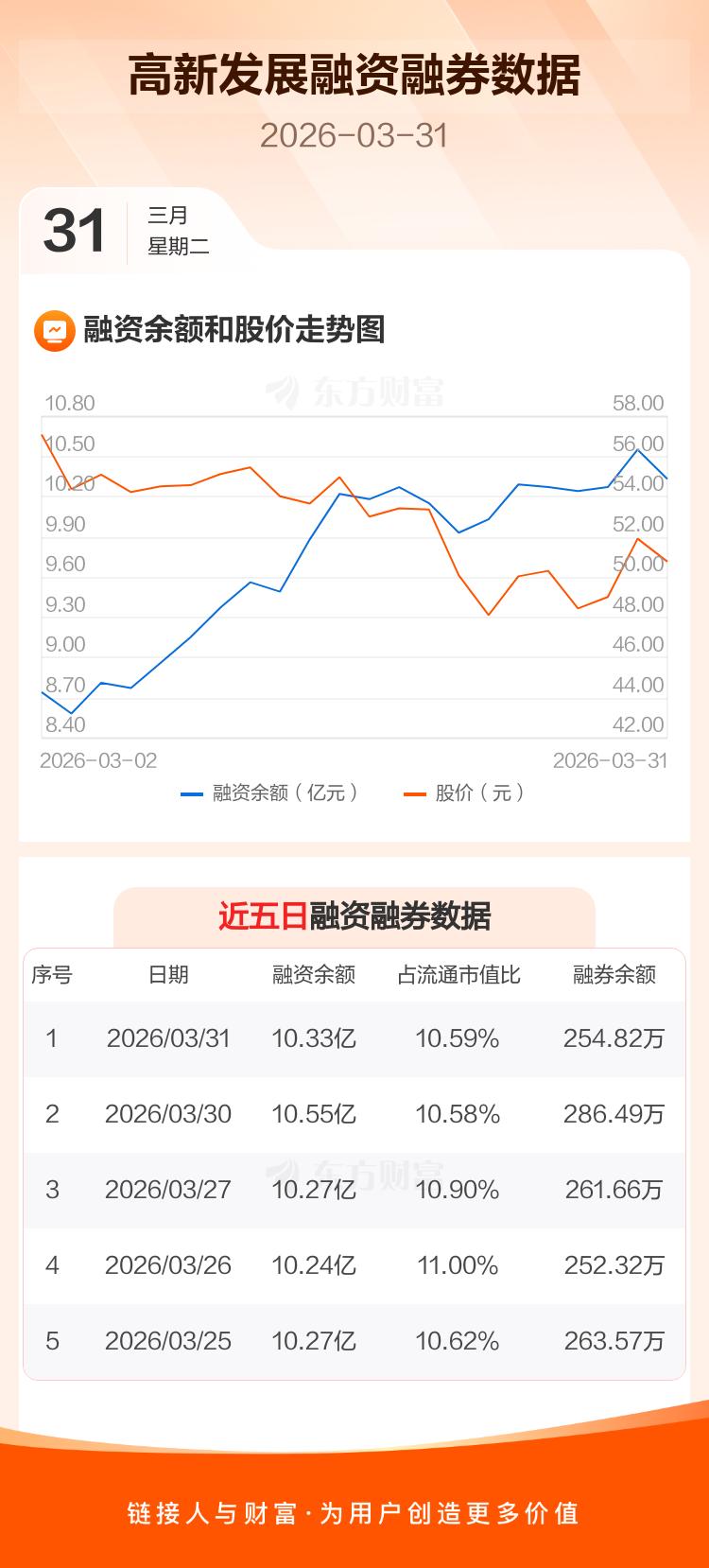交易所最新数据显示,高新发展于2026年3月31日获融资买入3048.22万元,融资偿还5249.85万元,当日融资净偿还2201.63万元。目前,该股融资余额10.33亿,占流通市值比例为10.59%。