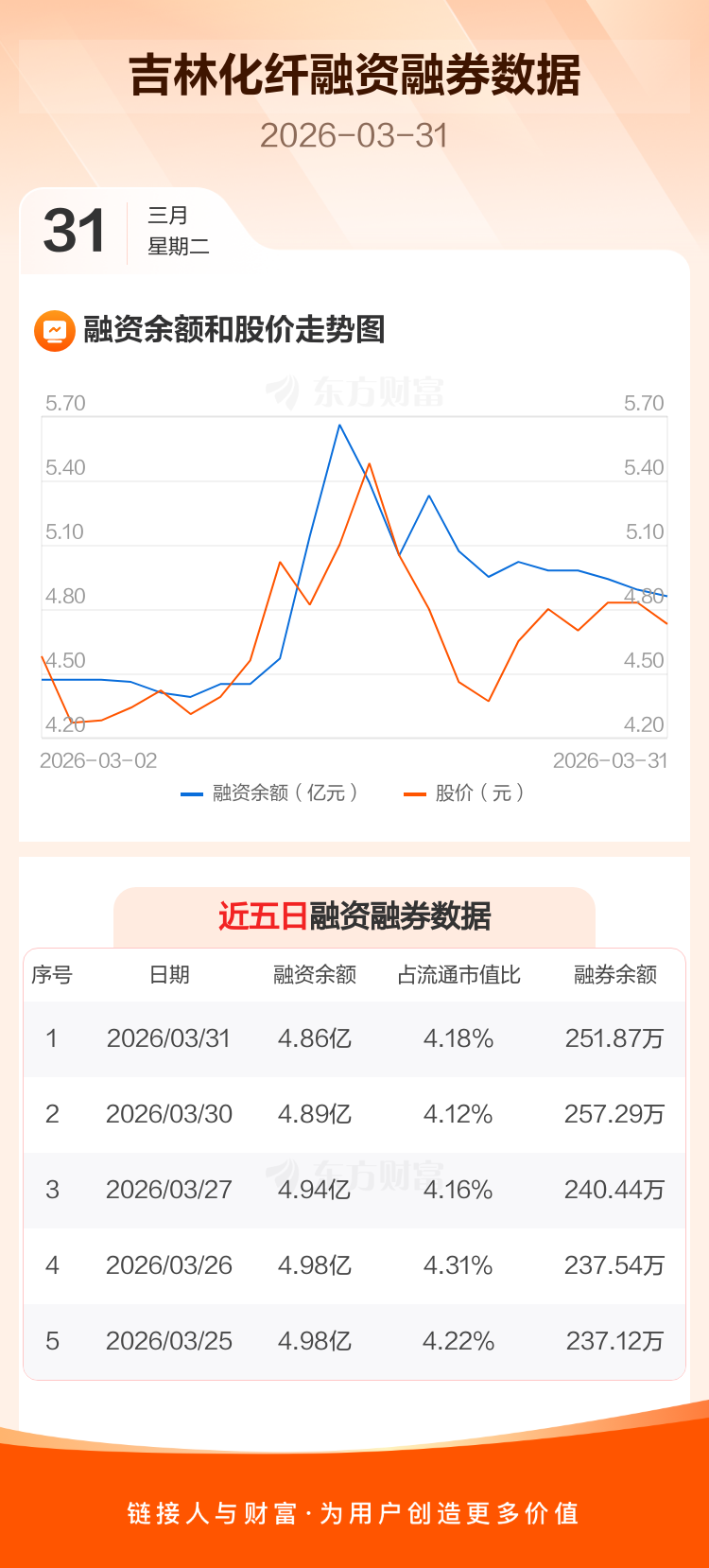 交易所最新数据显示,吉林化纤于2026年3月31日获融资买入3753.10万元,融资偿还4117.14万元,当日融资净偿还364.04万元。目前,该股融资余额4.86亿,占流通市值比例为4.18%。