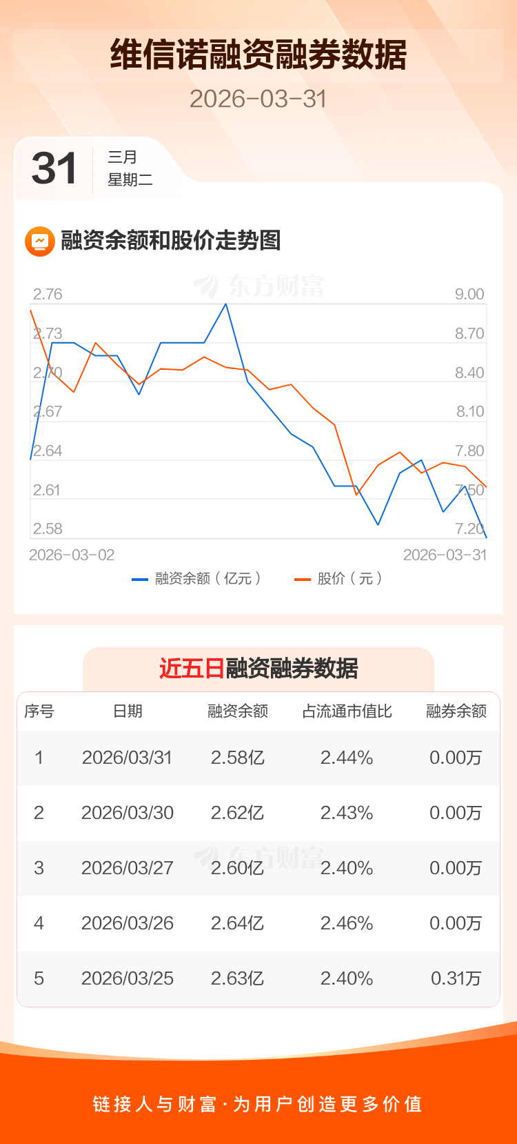 交易所最新数据显示,维信诺于2026年3月31日获融资买入539.44万元,融资偿还962.04万元,当日融资净偿还422.6万元。目前,该股融资余额2.58亿,占流通市值比例为2.44%。