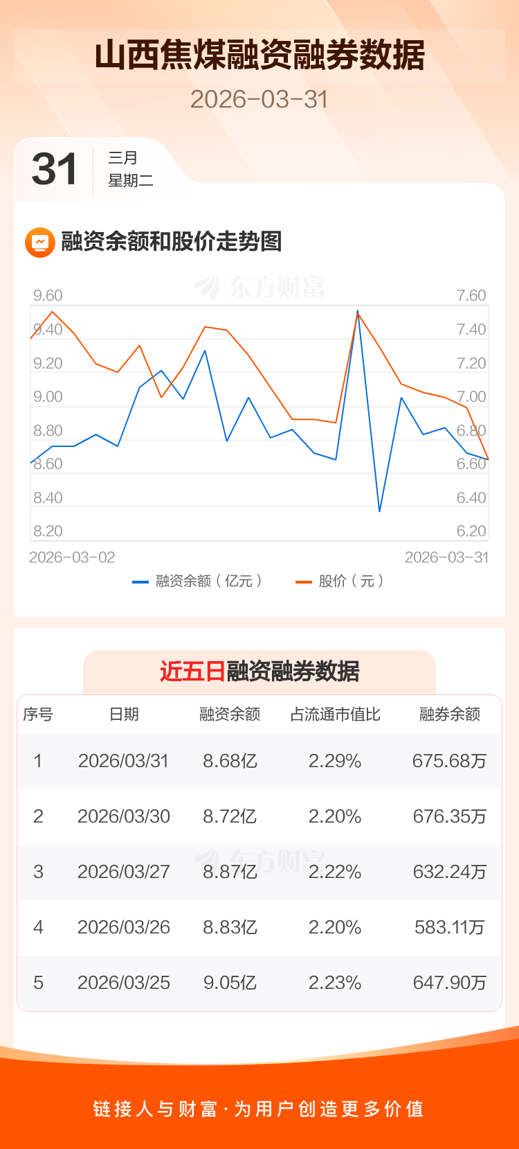 交易所最新数据显示,山西焦煤于2026年3月31日获融资买入8195.75万元,融资偿还8568.69万元,当日融资净偿还372.95万元。目前,该股融资余额8.68亿,占流通市值比例为2.29%。